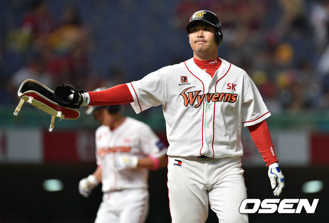 8회말 1사 만루에서 SK 이재원이 밀어내기 볼넷을 얻어내고 보호대를 배트걸에게 건네고 있다.