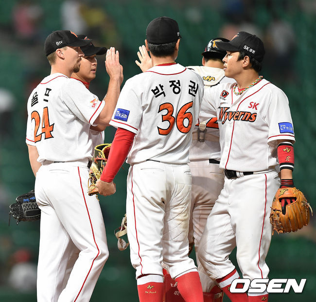 경기 종료 후 SK 선수들이 승리의 기쁨을 나누고 있다. /sunday@osen.co.kr