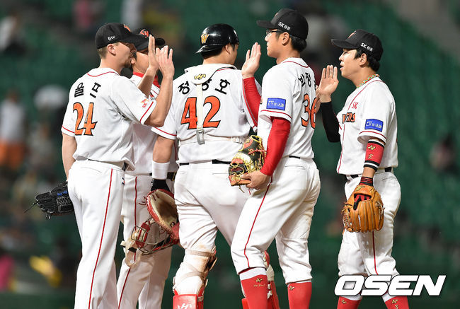경기 종료 후 SK 선수들이 승리의 기쁨을 나누고 있다. /sunday@osen.co.kr