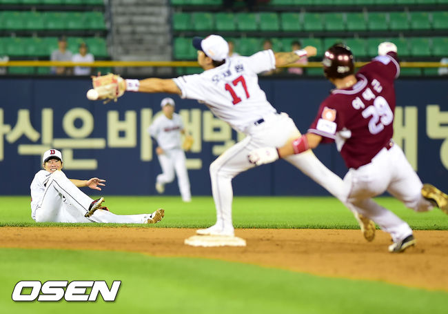 7일 오후 잠실 야구장에서 열린 '2014 한국야쿠르트 세븐 프로야구' 두산 베어스와 넥센 히어로즈의 경기, 연장 11회초 2사 주자 1루 넥센 유한준의 유격수 앞 내야안타때 두산 유격수 김재호가 넘어지며 볼을 잡은 후 2루로 송구하는 과정에서 2루수 오재원이 볼을 잡지 못하고 있다.
