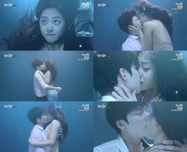 7일 오후 방송된 tvN 드라마 '잉여공주'에서는 키스를 나누는 인어 에이린(조보아 분)와 권시경(송재림 분)의 모습이 전파를 탔다.