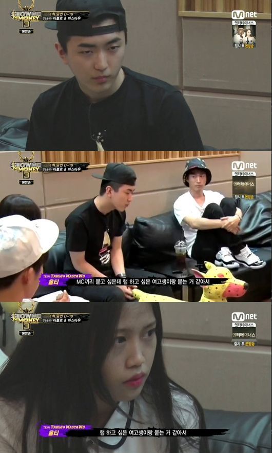 올티는 7일 방송된 엠넷 서바이벌 프로그램 ‘쇼미더머니3’에서 타블로가 육지담에게 “너 올티랑 붙어야 해. 할 수 있겠어?”라고 물은 후 자신에게도 같은 질문을 하자 “MC끼리 붙고 싶은데 랩 하고 싶은 여고생이랑 붙는 것 같아서 하고 싶지 않다”고 답했다.