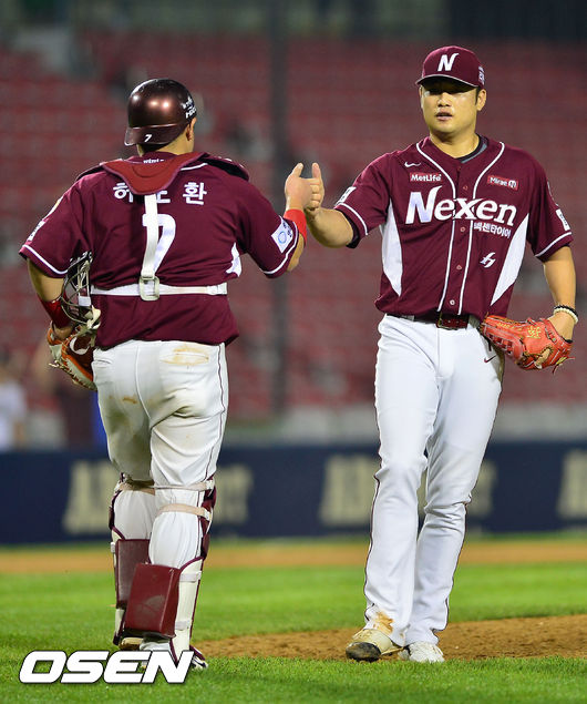 경기를 마치고 넥센 손승락과 허도환이 하이파이브를 하고 있다. / rumi@osen.co.kr