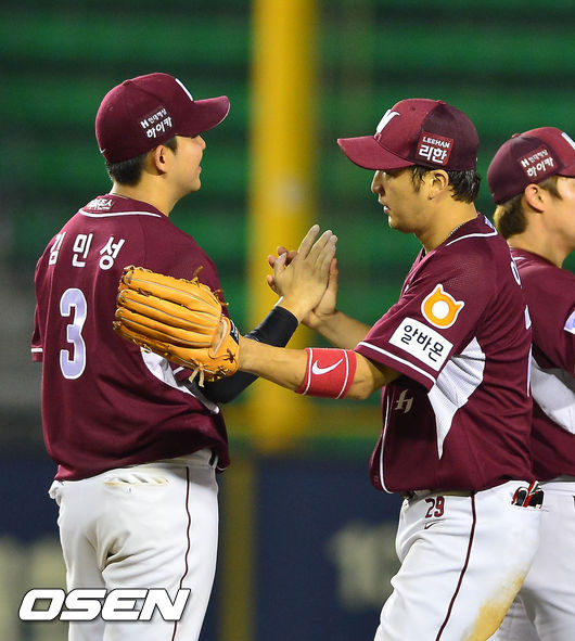 경기를 마치고 넥센 김민성이 이택근과 하이파이브를 하고 있다. / rumi@osen.co.kr