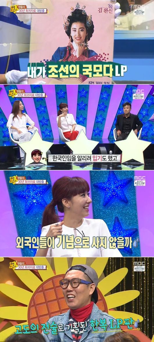 김완선은 7일 오후 방송된 MBC 예능프로그램 ‘별바라기’ ‘30년 희귀자료 방출’ 코너에서 자신의 LP판을 공개했다. 그 중 눈에 띄는 LP판은 일명 ‘내가 조선의 국모다’ 버전으로, 한복 입은 김완선의 모습이 그려져 있었다.