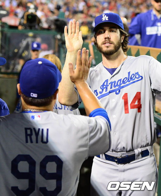 8일(한국시간) 미국 캘리포니아주 애너하임 에인절스타디움에서 열린 '2014 메이저리그' LA 에인절스와 LA 다저스의 경기,LA 다저스 류현진이 경기 전 댄 하렌과 하이파이브를 하고 있다.