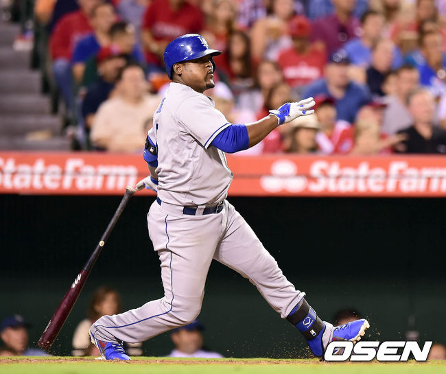 8일(한국시간) 미국 캘리포니아주 애너하임 에인절스타디움에서 열린 '2014 메이저리그' LA 에인절스와 LA 다저스의 경기, 5회초 유리베가 2루타로 타점을 올리고 있다.