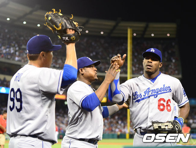 8일(한국시간) 미국 캘리포니아주 애너하임 에인절스타디움에서 열린 '2014 메이저리그' LA 에인절스와 LA 다저스의 경기,6회말 2사 2,3루 푸이그가 에인절스 해밀턴의 잘맞은 타구를 점프 캐치하고 류현진과 하아파이브를 하고 있다.