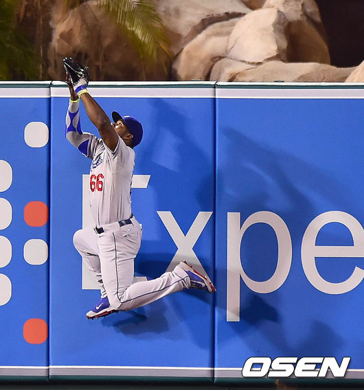 8일(한국시간) 미국 캘리포니아주 애너하임 에인절스타디움에서 열린 '2014 메이저리그' LA 에인절스와 LA 다저스의 경기,6회말 2사 2,3루 푸이그가 에인절스 해밀턴의 잘맞은 타구를 점프 캐치해 류현진의 위기를 넘기고 있다.