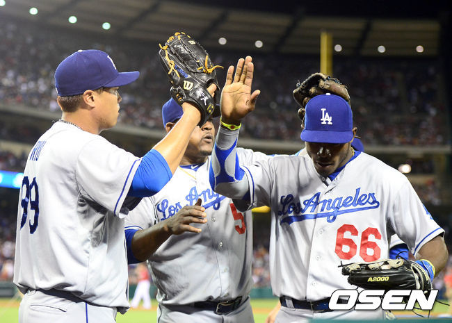 8일(한국시간) 미국 캘리포니아주 애너하임 에인절스타디움에서 열린 '2014 메이저리그' LA 에인절스와 LA 다저스의 경기,6회말 2사 2,3루 푸이그가 에인절스 해밀턴의 잘맞은 타구를 점프 캐치해 위기를 넘기자 류현진이 반갑게 맞이하고 있다.