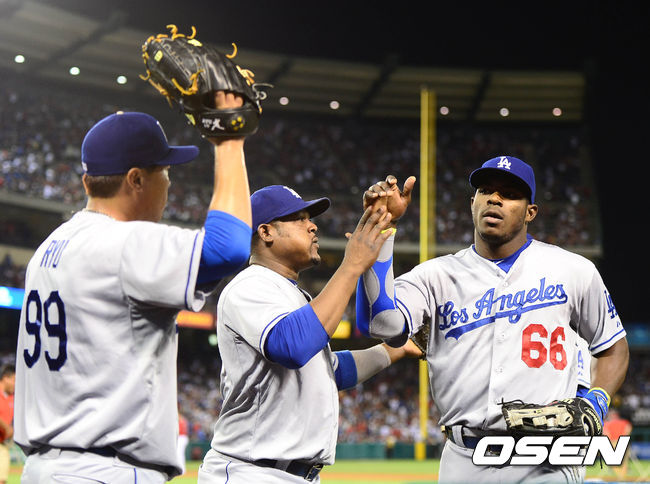 6회말 호수비를 펼친 푸이그를 류현진이 반갑게 맞이하고 있다./youngrae@osen.co.kr