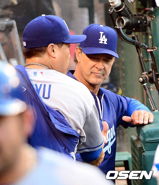 경기 전 매팅리 감독이 호투를 기원하며 류현진과 악수를 나누고 있다./youngrae@osen.co.kr