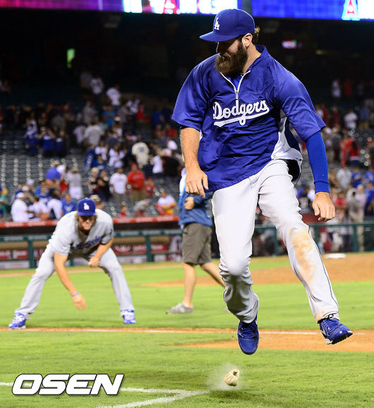 승리를 거둔 다저스 밴 슬라이크가 커쇼가 던진 로진팩을 피하고 있다./youngrae@osen.co.kr