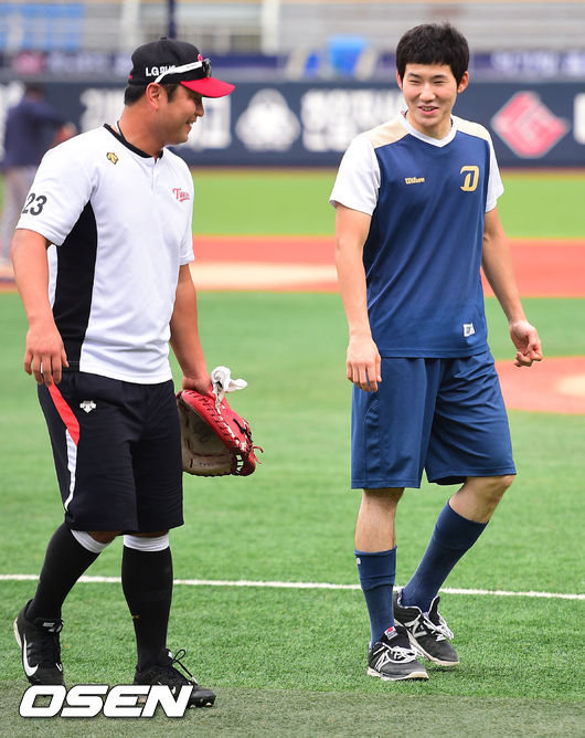 8일 오후 경남 창원 마산구장에서 열리는 2014 한국야쿠르트 세븐 프로야구 NC 다이노스와 LG 트윈스의 경기에 앞서 LG 최경철과 NC 박민우가 이야기를 나누고 있다.