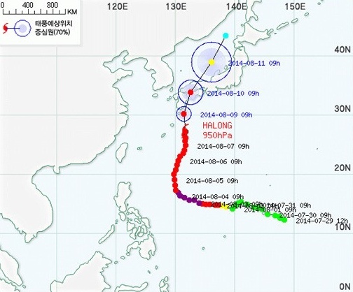 제11호 태풍 할롱 경로가 한반도를 관통할 것이라는 기존 예상과 달리 일본으로 북상하고 잇다.