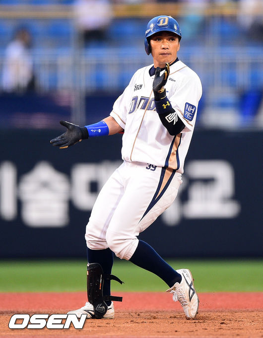 8일 오후 경남 창원 마산구장에서 열린 2014 한국야쿠르트 세븐 프로야구 NC 다이노스와 LG 트윈스의 경기,1회말 무사 1,2루 NC 이종욱이 동점 1타점 적시타를 날리고 환호하고 있다.