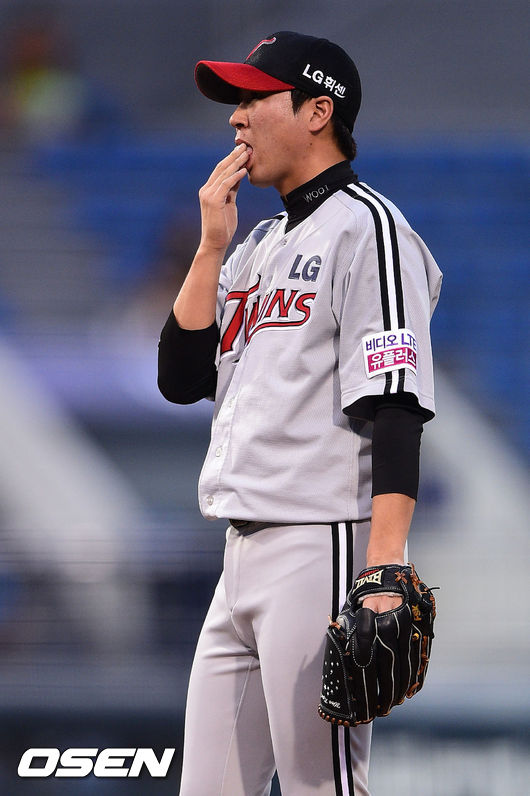 8일 오후 경남 창원 마산구장에서 열린 2014 한국야쿠르트 세븐 프로야구 NC 다이노스와 LG 트윈스의 경기,1회말 무사 폭투로 역전을 허용한 LG 우규민 선발투수가 손에 침을 바르고 있다.