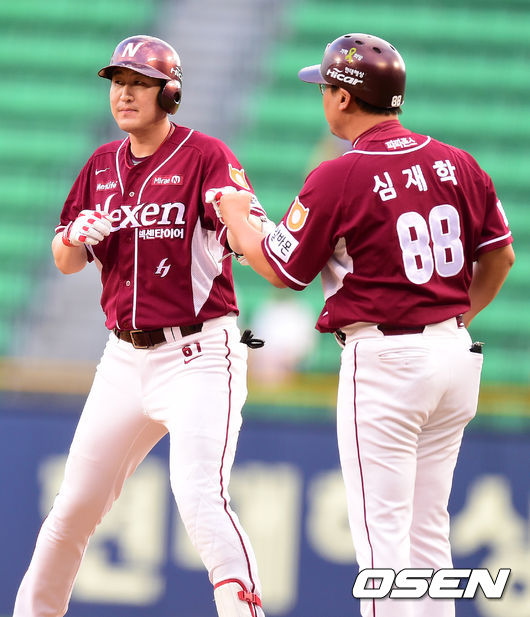 1회초 무사 1,3루에서 넥센 유한준이 선취1타점 중전 적시타를 날리고 심재학 코치와 기뻐하고 있다.