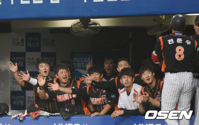 8일 오후 대구 야구장에서 열린 '2014 한국야쿠르트 세븐 프로야구' 삼성 라이온즈와 롯데 자이언츠 경기,2회초 2사 2루 전준우 2타점 인사이드 더 파크 홈런을 날리고 홈인 덕아웃 동료들의 축하를 받고 있다.