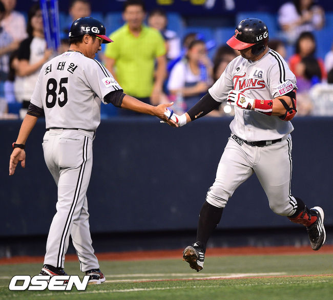8일 오후 경남 창원 마산구장에서 열린 2014 한국야쿠르트 세븐 프로야구 NC 다이노스와 LG 트윈스의 경기, 2회초 LG 최경철이 동점 솔로홈런을 날리고 최태원 코치와 하이파이브를 하고 있다