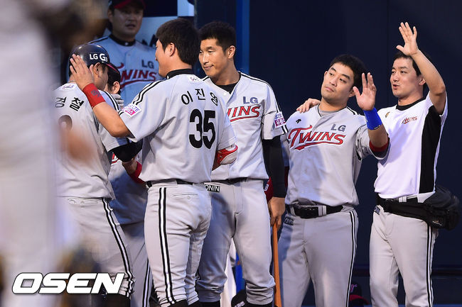 8일 오후 경남 창원 마산구장에서 열린 2014 한국야쿠르트 세븐 프로야구 NC 다이노스와 LG 트윈스의 경기, 2회초 LG 최경철이 동점 솔로홈런을 날리고 동료들의 축하를 받고 있다.