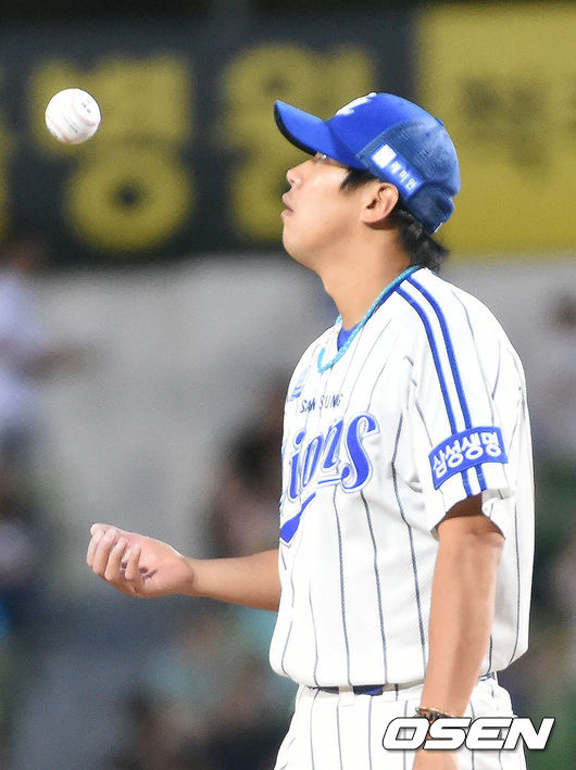 8일 오후 대구 야구장에서 열린 '2014 한국야쿠르트 세븐 프로야구' 삼성 라이온즈와 롯데 자이언츠 경기,삼성 선발 윤성환이 두타자 연속 몸에 맞는볼로 진루 시키며 아쉬워 하고 있다.