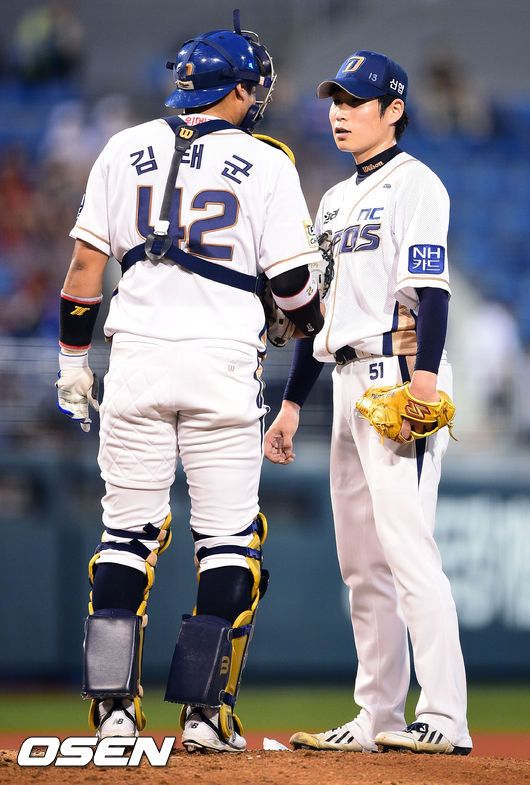 8일 오후 경남 창원 마산구장에서 열린 2014 한국야쿠르트 세븐 프로야구 NC 다이노스와 LG 트윈스의 경기, 3회초 LG 선두타자 정성훈에게 안타를 허용한 NC 선발투수 이재학과 김태군 포수가 마운드에서 이야기를 나누고 있다