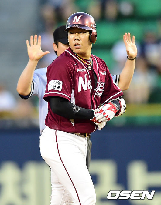 3회초 무사에서 넥센 강정호가 2루타를 날리고 타임을 외치고 있다.