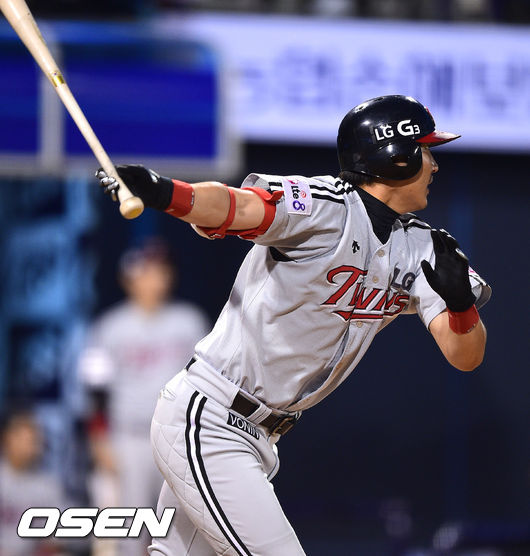8일 오후 경남 창원 마산구장에서 열린 2014 한국야쿠르트 세븐 프로야구 NC 다이노스와 LG 트윈스의 경기, 3회초 1사 만루 LG 이진영이 역전 희생플라이를 날리고 있다.