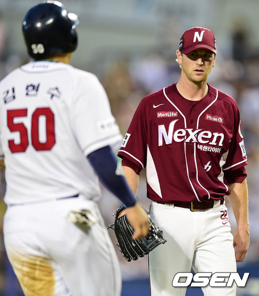 3회말 2사 2,3루에서 넥센 밴헤켄이 두산 홍성흔을 우익수 플라이로 처리하며 더그아웃으로 향하고 있다.