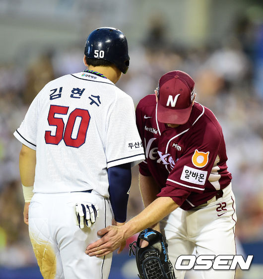 3회말 2사 2,3루에서 넥센 밴헤켄이 두산 홍성흔을 우익수 플라이로 처리하고 2루주자 김현수를 격려하며 더그아웃으로 향하고 있다.
