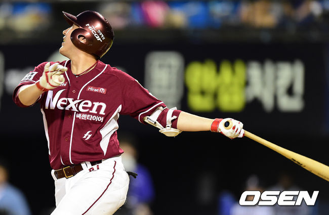 4회초 1사 2,3루에서 넥센 유한준이 1타점 적시타를 날리고 타구를 바라보고 있다.
