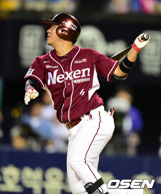 4회초 2사 2,3에서 넥센 김민성이 1타점 적시타를 날리며 타구를 바라보고 있다.