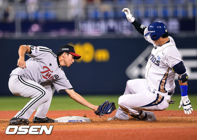 8일 오후 경남 창원 마산구장에서 열린 2014 한국야쿠르트 세븐 프로야구 NC 다이노스와 LG 트윈스의 경기, 4회말 1사 NC 모창민이 안타를 날리고 2루에서 LG 김용의 2루수에게 태그아웃되고 있다.