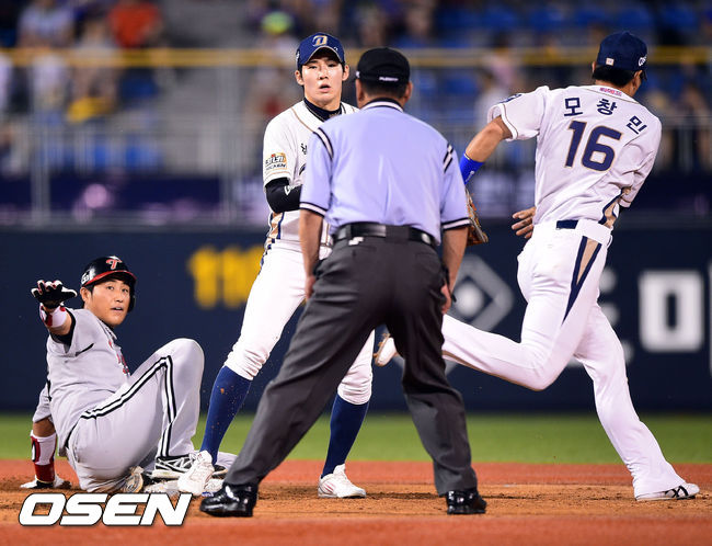 8일 오후 경남 창원 마산구장에서 열린 2014 한국야쿠르트 세븐 프로야구 NC 다이노스와 LG 트윈스의 경기,5회초 무사 2루 LG 이진영의 내야땅볼때 2루 주자 채은성이 3루수 모창민에게 태그아웃되고 있다.