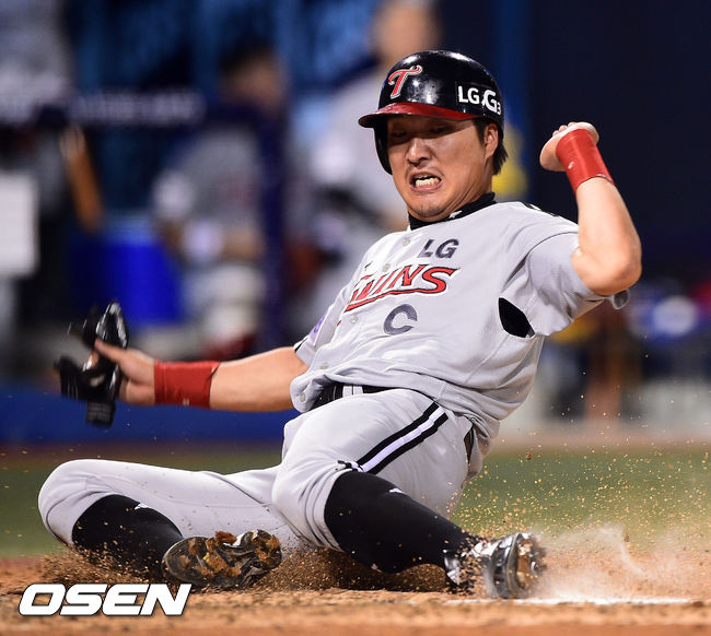 8일 오후 경남 창원 마산구장에서 열린 2014 한국야쿠르트 세븐 프로야구 NC 다이노스와 LG 트윈스의 경기,5회초 1,2루 LG 손주인의 1타점 적시타때 2루 주자 이진영이 홈에 세이프되고 있다.