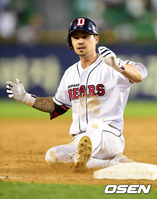 5회말 1사 1,2루에서 두산 오재원이 2타점 적시 3루타를 날리고 슬라이딩하며 세이프되고 있다.
