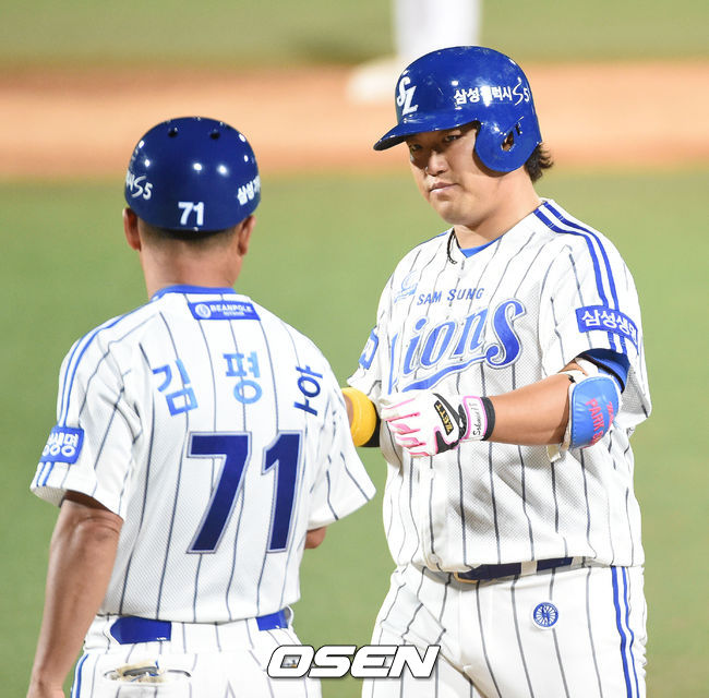 8일 오후 대구 야구장에서 열린 '2014 한국야쿠르트 세븐 프로야구' 삼성 라이온즈와 롯데 자이언츠 경기,6회말 2사 3루 박석민 1타점 적시타를 날리고 김평호 코치의 환영을 받고 있다.