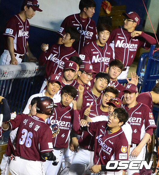 7회초 무사에서 넥센 이성열이 솔로포를 날리고 더그아웃에서 동료선수들과 기뻐하고 있다.