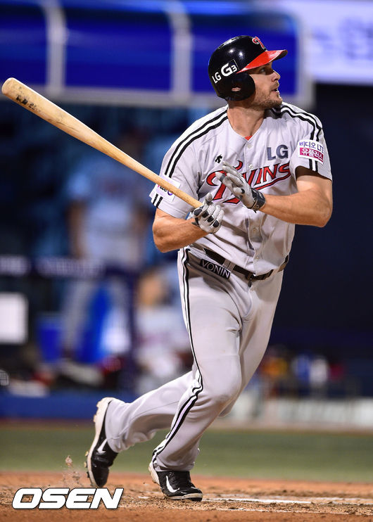 8일 오후 경남 창원 마산구장에서 열린 2014 한국야쿠르트 세븐 프로야구 NC 다이노스와 LG 트윈스의 경기, 7회초 LG 선두타자 스나이더가 솔로홈런을 날리고 있다.