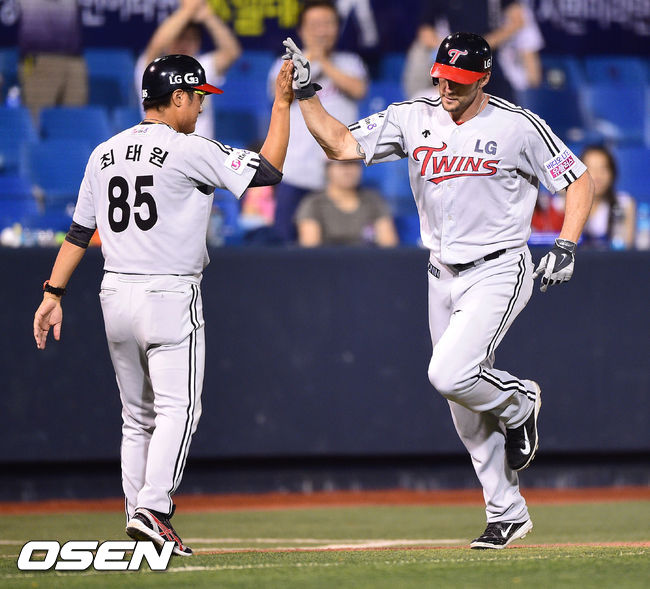 8일 오후 경남 창원 마산구장에서 열린 2014 한국야쿠르트 세븐 프로야구 NC 다이노스와 LG 트윈스의 경기, 7회초 LG 선두타자 스나이더가 솔로홈런을 날리고 베이스를 돌고 있다.