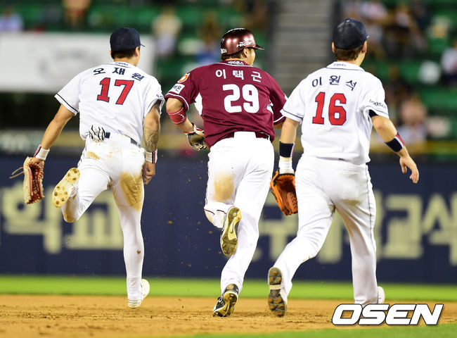 6회초 1사 2루서 넥센 유한준의 3루 땅볼에 2루주자 이택근이 협살에 걸려 두산 2루수 오재원과 부딪히고 있다.