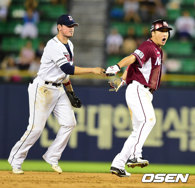 6회초 1사 2루서 넥센 유한준의 3루 땅볼에 2루주자 이택근이 협살에 걸려 아웃된 후 두산 2루수 오재원의 주루방해가 있었다며 항의하고 있다.