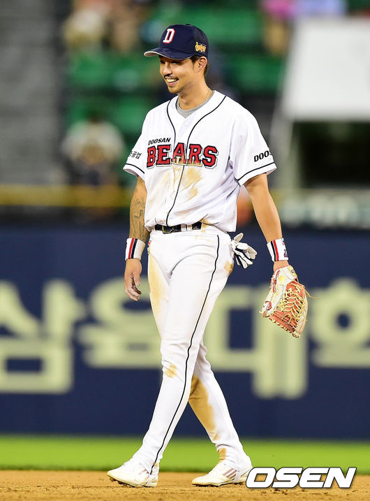 6회초 1사 2루서 넥센 유한준의 3루 땅볼에 2루주자 이택근이 협살에 걸려 아웃된 후 두산 2루수 오재원의 주루방해가 있었다며 항의하자 오재원이 미소짓고 있다.