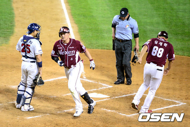 7회초 무사에서 넥센 이성열이 솔로포를 날리고 홈을 밟고 있다.
