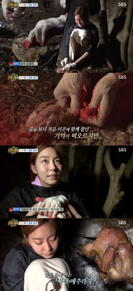유이는 8일 오후 방송된 SBS 예능프로그램 '정글의 법칙 in 인도양'에서 식량을 구하지 못하자 '최후의 보루'로 남겨뒀던 메추라기 메리를 구워 먹었다.