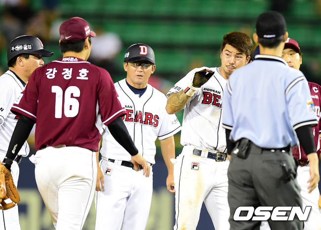 8회말 1사 1,3루에서 두산 최주환의 2루 땅볼에 오재원이 포스아웃당하고 수비방해로 병살 처리 됐다. 오재원이 강정호에 상황 설명을 하고 있다.