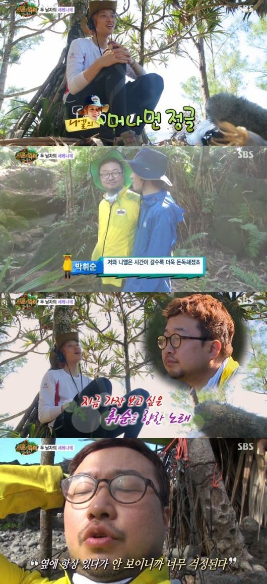 박휘순, 니엘은 8일 오후 방송된 SBS 예능프로그램 '정글의 법칙 in 인도양'에서 나홀로 생존에 도전하며 서로를 그리워했다.