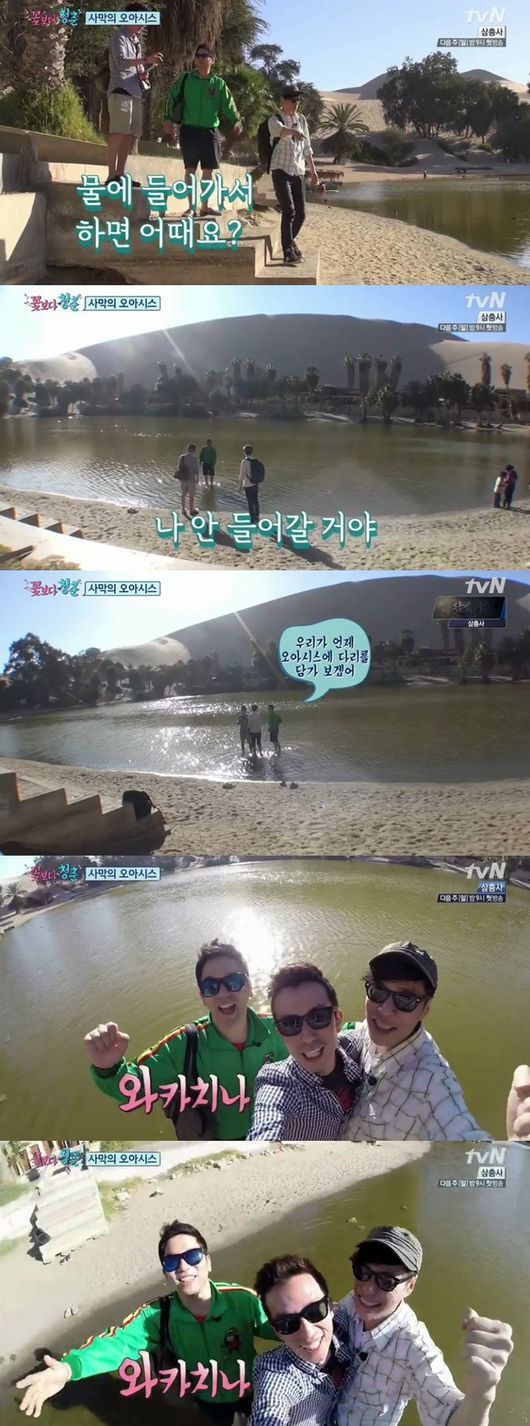 8일 방송된 tvN 예능프로그램 '꽃보다 청춘'(연출 나영석 신효정) 2회에서는 40대를 넘긴 뮤지션 세사람이 사막의 오아시스에 발을 '퐁당' 담근 채 아이처럼 기뻐하는 모습이 그려졌다.