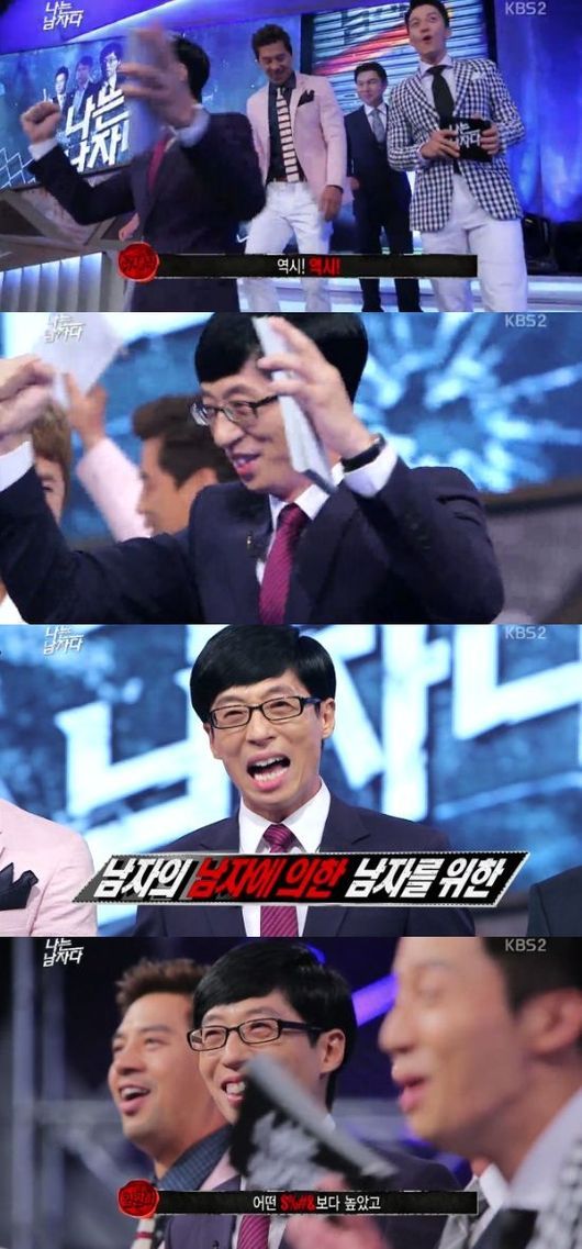 유재석은 8일 오후 방송된 KBS 2TV 예능프로그램 '나는 남자다'에서 "유재석!"을 연호하는 방청객들 앞에 등장했다.